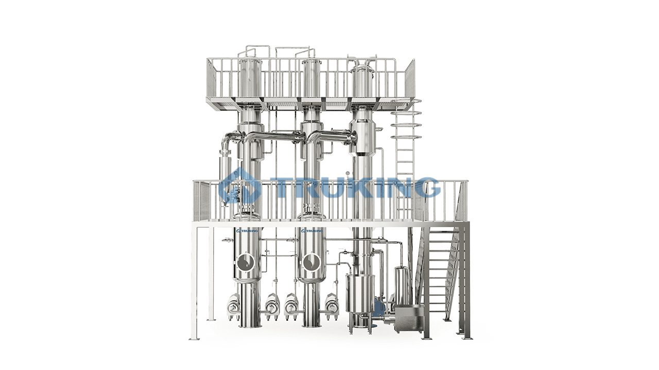 El líquido material que se concentraentra en el calentadordesde la parte superior, en función del distribuidor, entra de manerauniforme en el tubo de calefacción, a lo largo de la pared interior del tubo, fluyenaturalmentehaciaabajocomo forma de película, y se evaporó y concentró bajocalor. El líquidoconcentradodel material y el vapor secundarioentran en el separadorpara la separación. El vapor secundario se libera de la parte superior delseparador. Parte del vapor secundarioentra en la bomba de calor y parte del vapor secundarioentra en el calentador de efectosecundarioparaahorrarenergía.